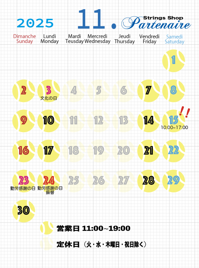 11月の予定です パルリストの皆様、スケジューリングよろしくお願い致します Post Views: 0 入間市 テニスショップ スポーツショップ 日高市 飯能市 青梅市 狭山市 所沢市 スポーツショップ ガット張り ソフトテニスShare this postFacebookTwitterPinterestGoogle+