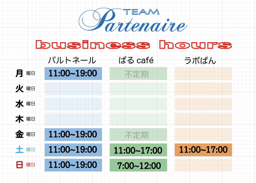 パルトネール、毎週金曜日から月曜日までの4日間営業です